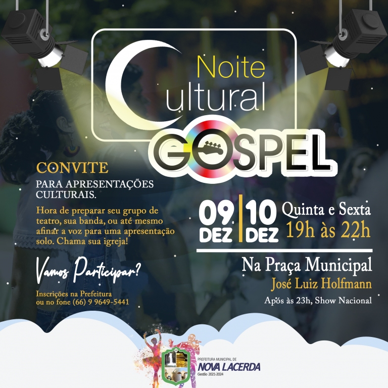 Hora de preparar seu grupo de teatro, sua banda, ou até mesmo afinar a voz para uma apresentação solo. Chama sua igreja para participar dessa noite mais que especial. Vocês poderão se inscrever para fazerem suas apresentações Culturais no período das 19h às 22h, nos dias 09 e 10 de dezembro, onde posteriormente haverá um grandioso Show regional para toda população.