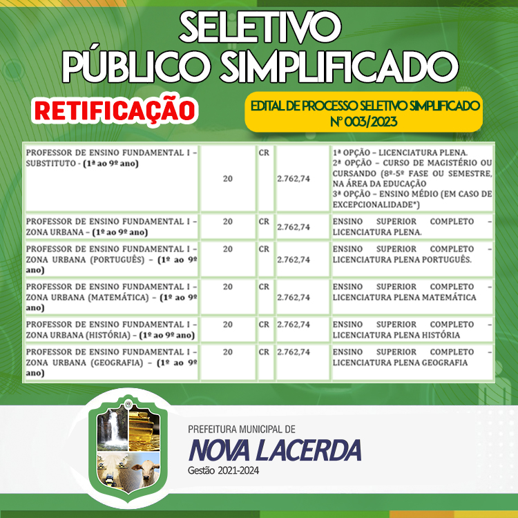 A RETIFICAÇÃO DO EDITAL 003/2023 - PROCESSO SELETIVO SIMPLIFICADO, referente aos cargos PROFESSOR DE ENSINO FUNDAMENTAL I – SUBSTITUTO, PROFESSOR DE ENSINO FUNDAMENTAL I – ZONA URBANA, PROFESSOR DE ENSINO FUNDAMENTAL I – ZONA URBANA (PORTUGUÊS), PROFESSOR DE ENSINO FUNDAMENTAL I – ZONA URBANA (MATEMÁTICA), PROFESSOR DE ENSINO FUNDAMENTAL I – ZONA URBANA (HISTÓRIA), PROFESSOR DE ENSINO FUNDAMENTAL I – ZONA URBANA da SECRETARIA MUNICIPAL DE EDUCAÇÃO E CULTURA, passando a ter as seguintes informações: